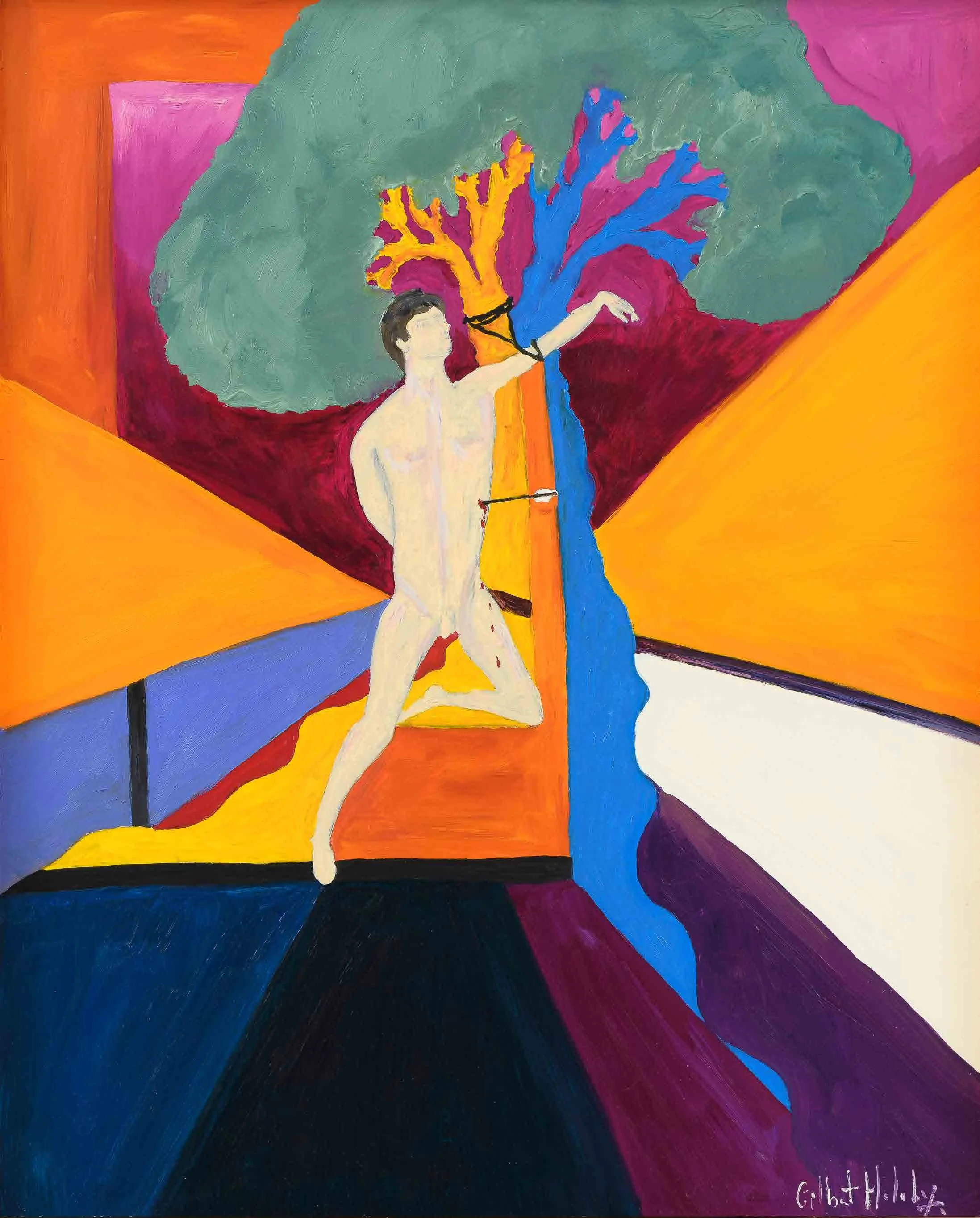 Four sets of paintings comprise the exhibition. The first consists of four round canvases, each 1 metre in diameter, depicting the seasons personified: by Bacchus (Summer), St Sebastian (Winter), Rilke (Autumn) and Rimbaud (Spring)—a playful and provocative, yet deeply considered, interpretation. The second is a set of four 150 x 150 cm canvases representing Halaby’s own olive groves in Tuscia, in the northern reaches of Lazio, where the Etruscans held sway for centuries before the Roman Empire ascended—a timeless landscape, whose character shifts evocatively with the seasons.