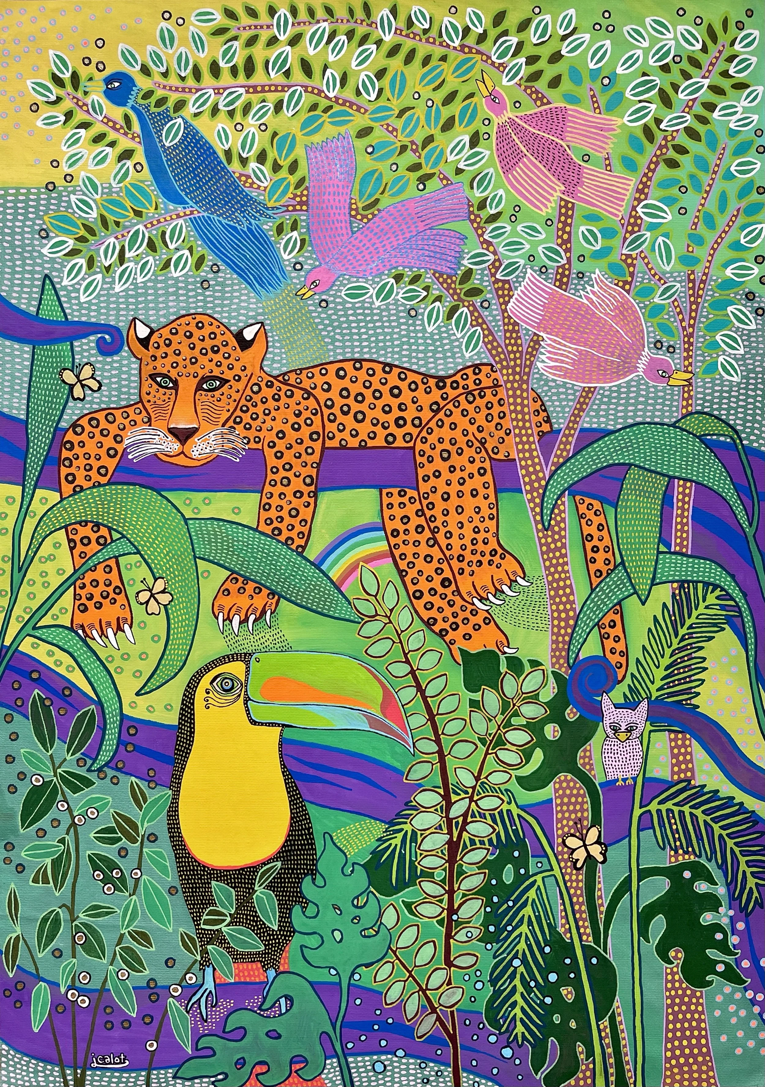 In Calot’s paintings, we enter the landscape of the psyche, where memory, sensation, and nature merge in continuous motion. His densely composed canvases unfold as living, breathing ecosystems — abundant with pattern and form that flow like emotional weather. These are not mere scenes but pulses, recording the passage of emotional time through layered gestures and luminous color. Forests, waters, and dreamlike figures intermingle, mapping the cycles of life, transformation, and inner reflection. Each work becomes a meditation on memory, sensation, and the rhythm of being — blending figuration and abstraction into a radiant, immersive continuum.