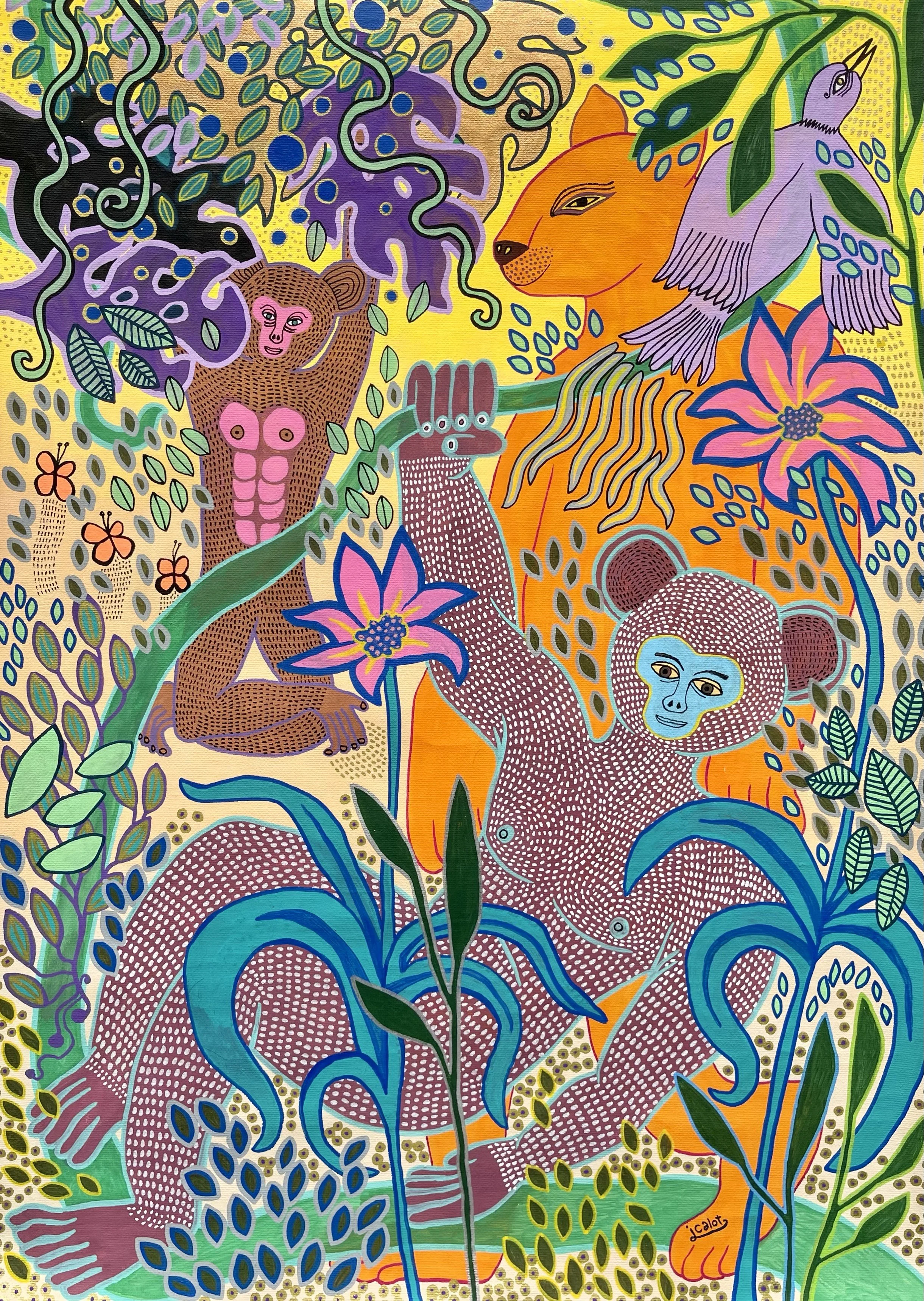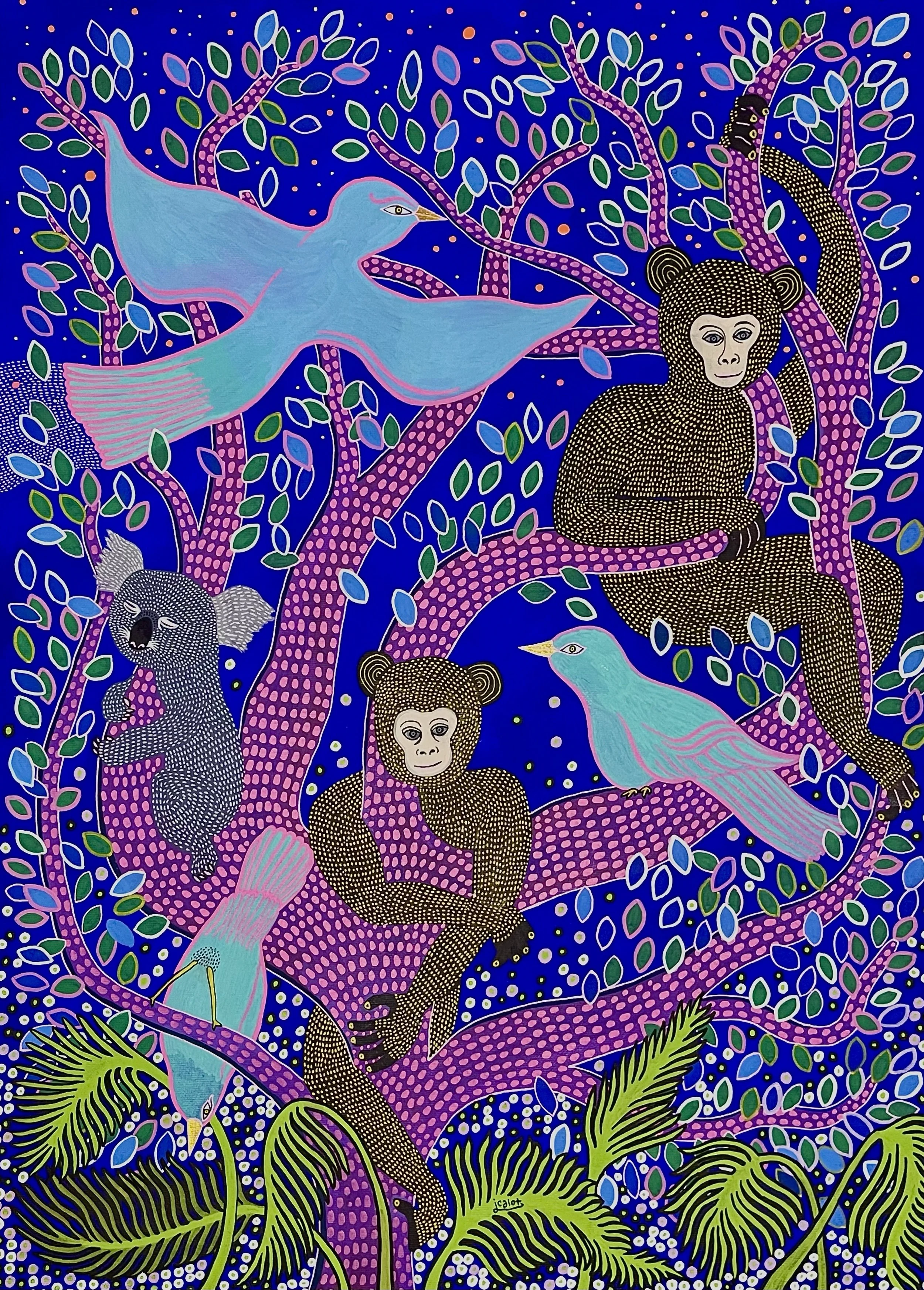 Julien Calot, Singes, Oiseaux et Koala, 2022/23, acrylic on canvas, 45 x 62 cm